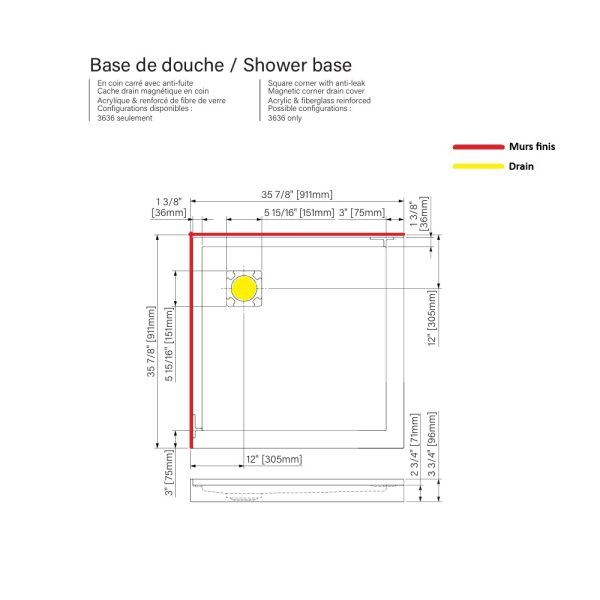 ZITTA – Base de douche en acrylique avec drain caché en coin (12po x 12po) – 36×60 Installation en COIN