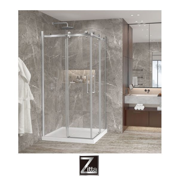 ZITTA – Ensemble porte coulissante VAGUE et base NEPTUNE Cache – Chrome – Installation en coin DROIT