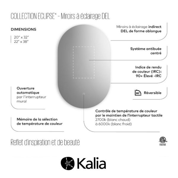 Kalia – ECLIPSE (Oblong) – Mirroir à éclairage DEL avec antibuée – 22po x 38po