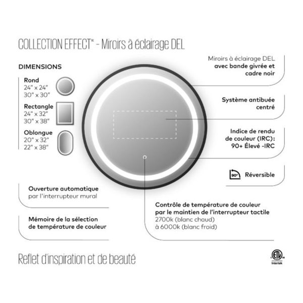 Kalia – EFFECT (Rectangle) – Mirroir à éclairage DEL avec antibuée – 30po x 38po