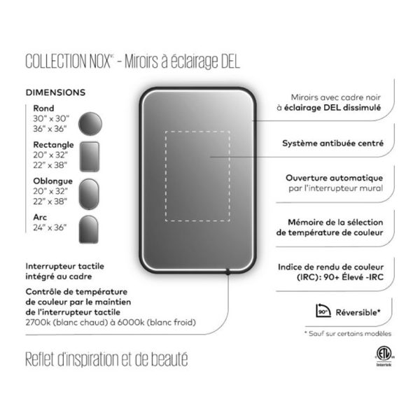 Kalia – NOX (Arche) – Mirroir à éclairage DEL avec antibuée – 24po x 36po