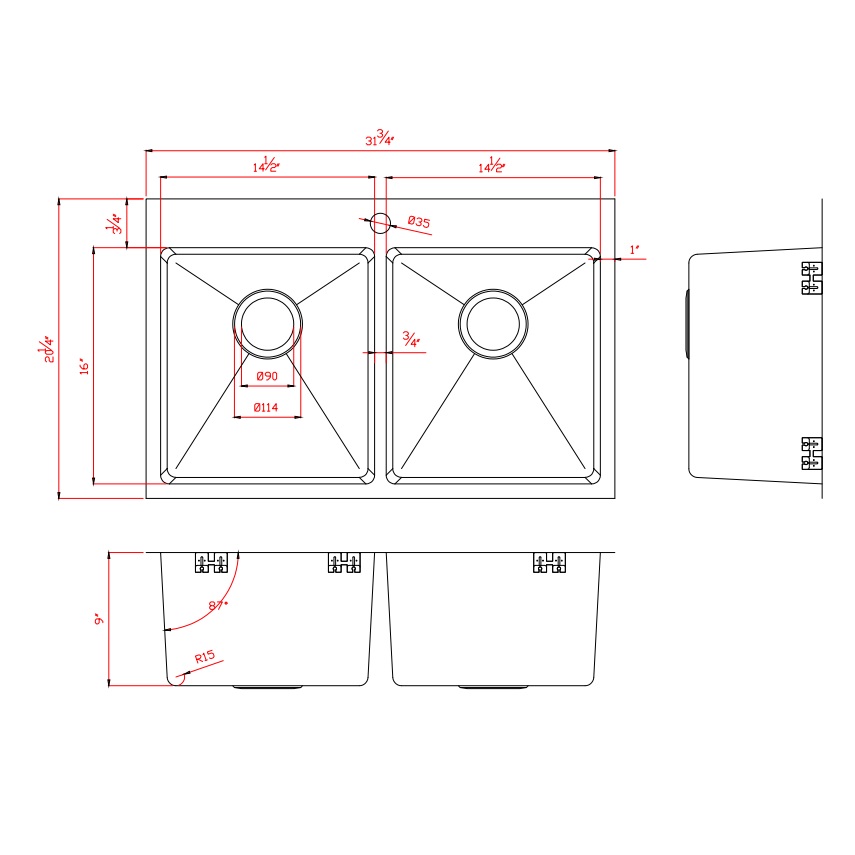 • Tailles des cuves : 14-1/4po x 16po x 9po
